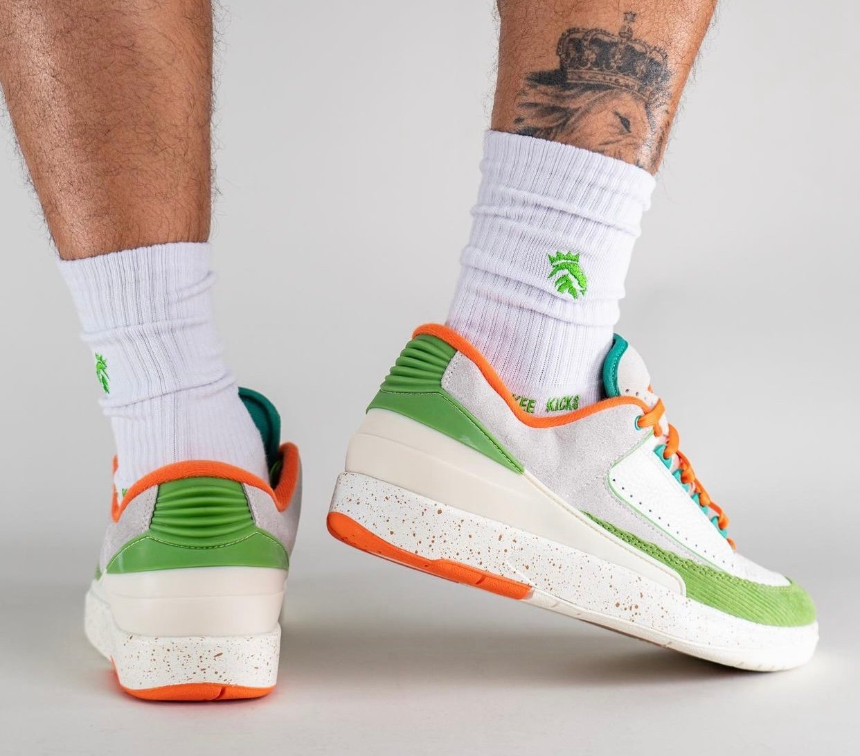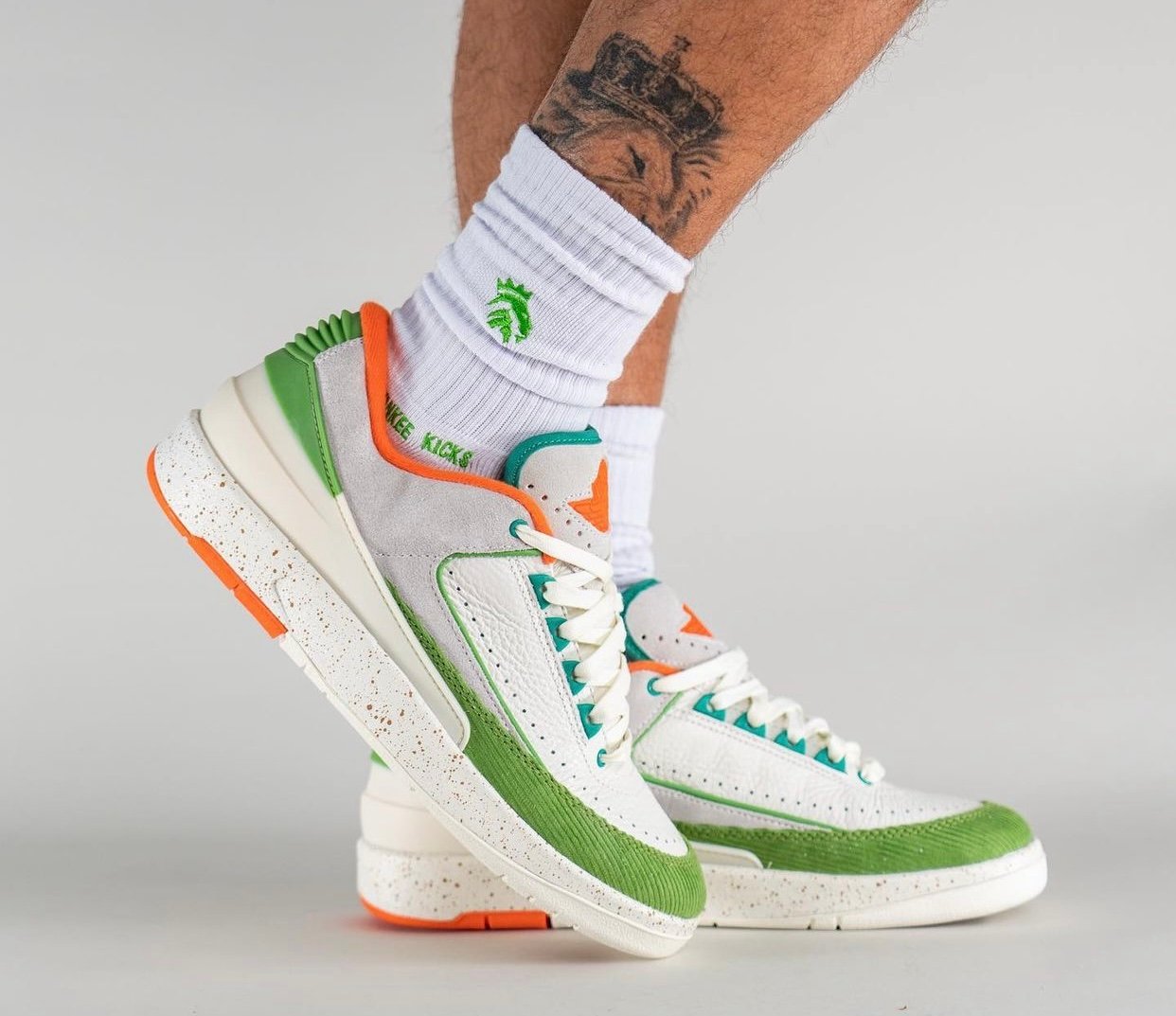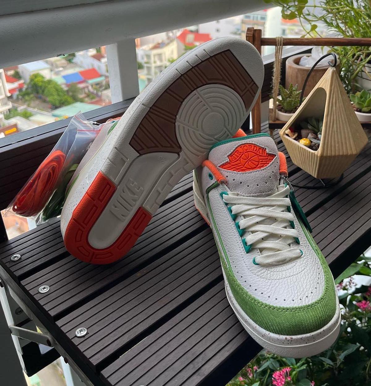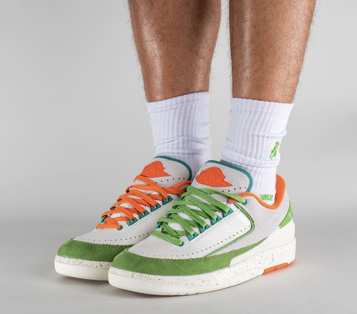 This low-top Air Jordan 2 comes dressed in a Sail, Safety Orange, Chlorophyll, and Coconut Milk color combination. Across the upper, we have a leather Sail with a tumbled finish, and Grey suede drapes the overlays. Next, Chlorophyll Green corduroy wraps the toe box and expands to the sides, and Orange adorns the liner and Jumpman on the tongue. We also have Teal eyelets and on the very top of the tongue. Other details include speckled detailing runs across the midsole, Titan branding on the hangtag, and special Titan graphics on the insoles.