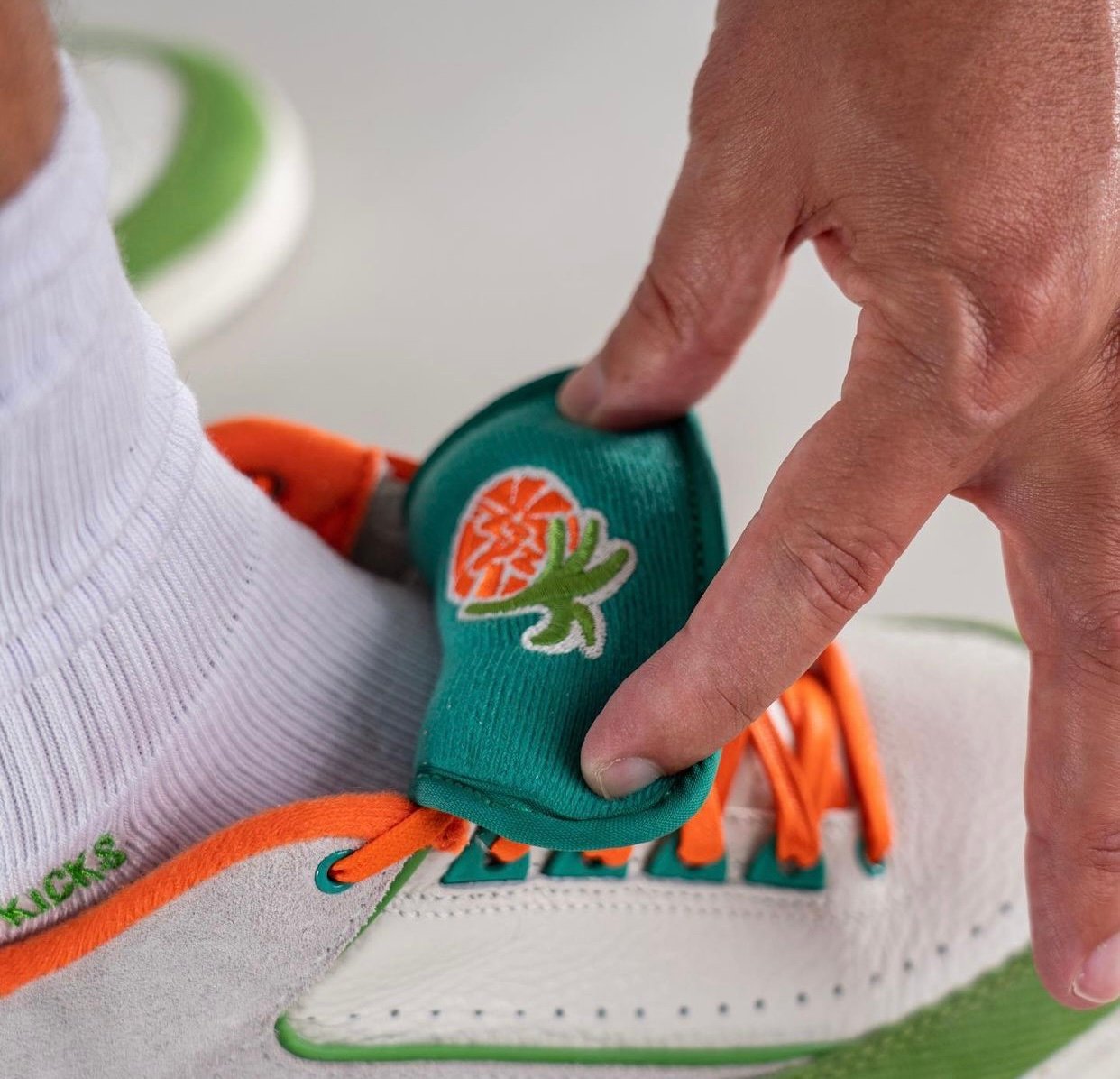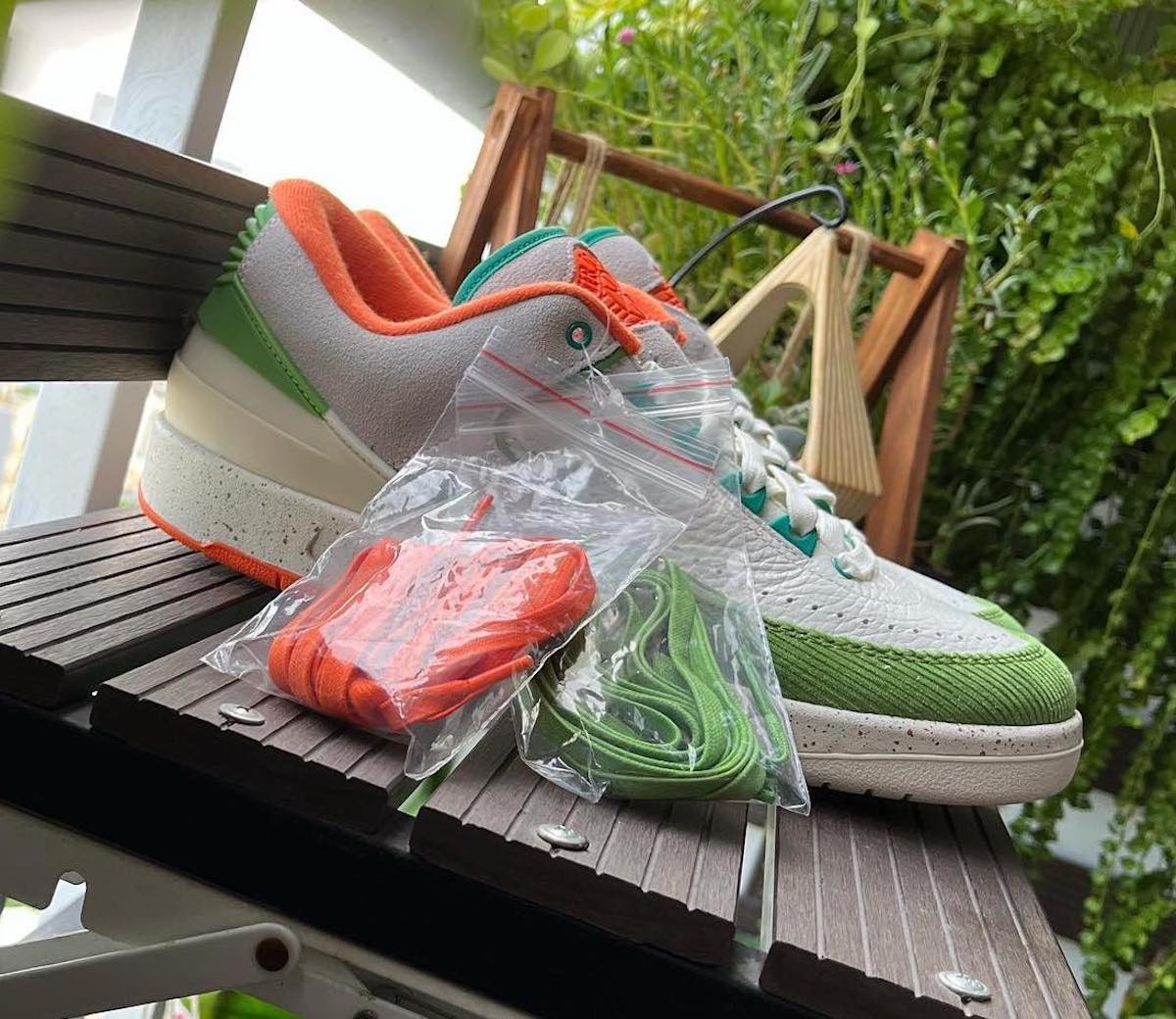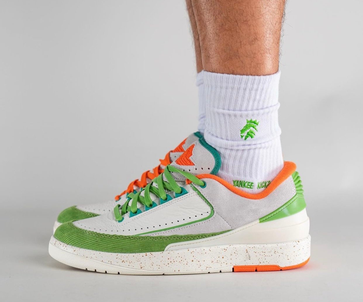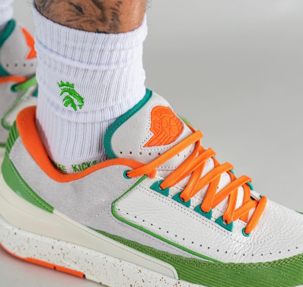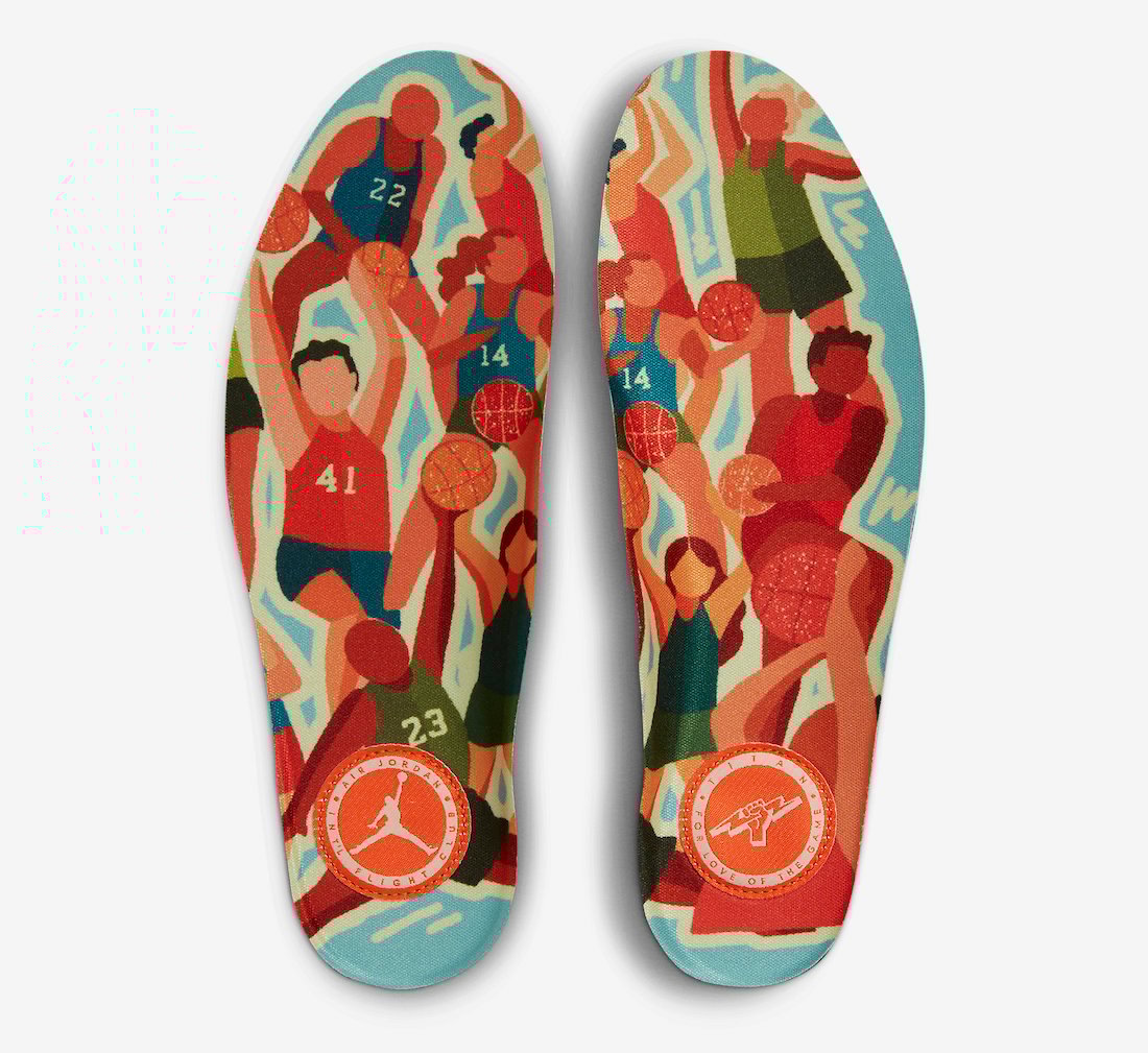 This low-top Air Jordan 2 comes dressed in a Sail, Safety Orange, Chlorophyll, and Coconut Milk color combination. Across the upper, we have a leather Sail with a tumbled finish, and Grey suede drapes the overlays. Next, Chlorophyll Green corduroy wraps the toe box and expands to the sides, and Orange adorns the liner and Jumpman on the tongue. We also have Teal eyelets and on the very top of the tongue. Other details include speckled detailing runs across the midsole, Titan branding on the hangtag, and special Titan graphics on the insoles.