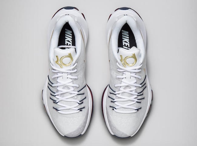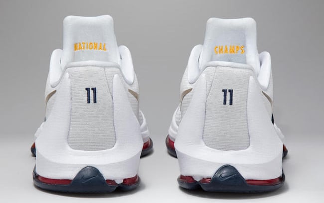 The Nike KD 8 used is from NikeID and comes in Grey, White, Navy and Red along with Metallic Gold across the Swoosh. On the inner tongue is ‘National Champs’ embroidered while the number ’11’ is placed on the heel that celebrates the teams’s record national championships.
