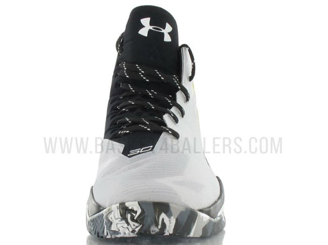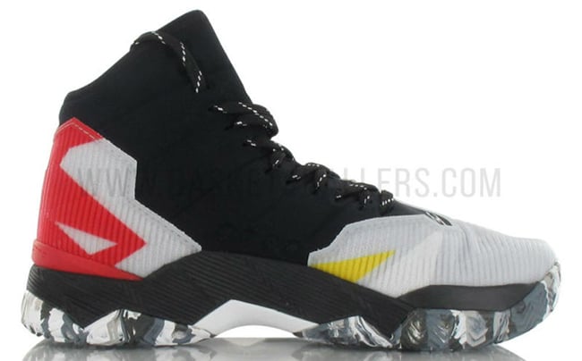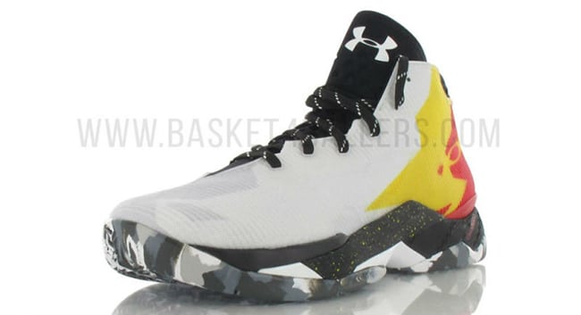 This Under Armour Curry 2.5 features a White, Black Yellow and Red color scheme which is lifted straight from the flag. In addition, the heel resembles that of the family crest of the Calvert and Crossland families located around the heel. Most of the upper is done in White while the midsole features Black with a Yellow speckled overlay. The sole has a camouflage like pattern which is done in White, Black and Grey.