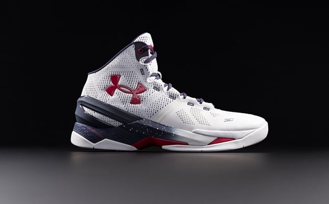 This patriotic theme used across the Under Armour Curry 2 features White, Midnight Navy and Red. Featuring White through the base along with the tongue. Midnight Navy accents are spread throughout but standing out is the use on the midsole that gradients to White. Other details include Red accents hitting branding, mixed within the laces and mid-foot.
