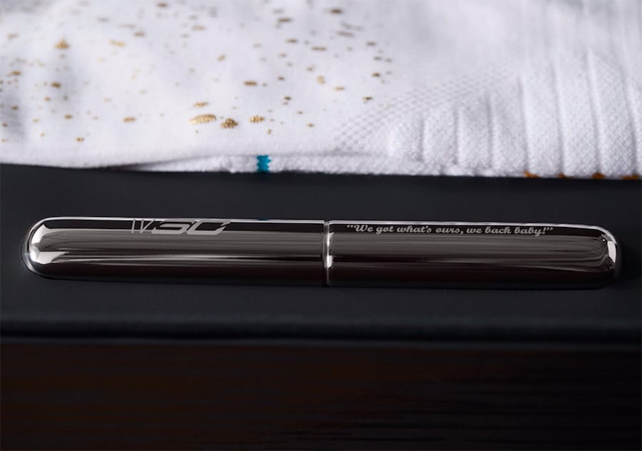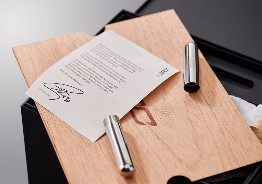 Two colorways of the UA Curry 4 is part of the pack which includes a White pair with Gold accents and a Black pair which White hints. Also coming with the pack is a golf divot tool which also is a cigar holder which represents Curry in the locker room after winning the 2017 NBA Finals. There is also two pairs of Stance socks and a signed letter that reads: