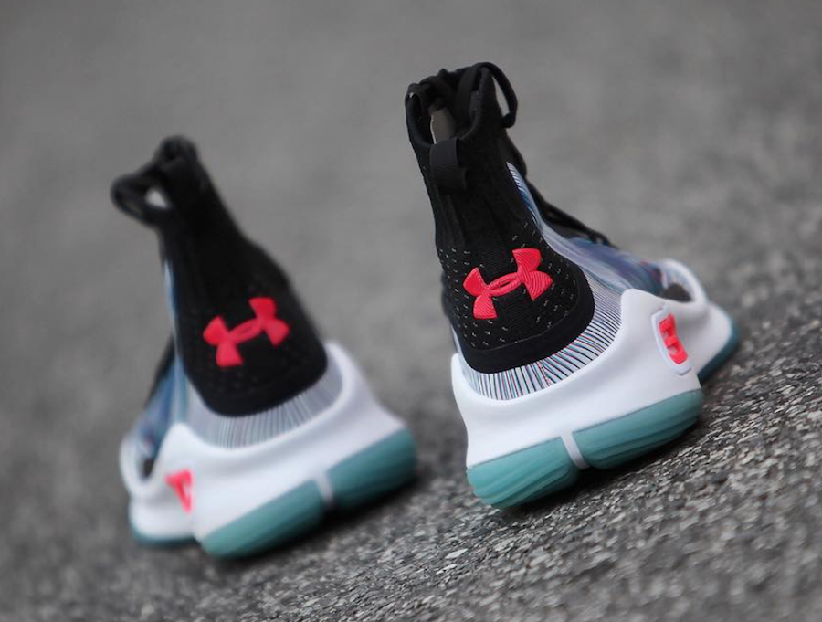 Looking closer at this Under Armour Curry 4, they feature a swirl graphic across the panels which extends across the heel and toe box. In addition we have Bright Crimson accents which lands on the heel and SC branding on the White midsole. Other highlights include Black on the tongue, eyestays and laces while a translucent outsole completes the look.