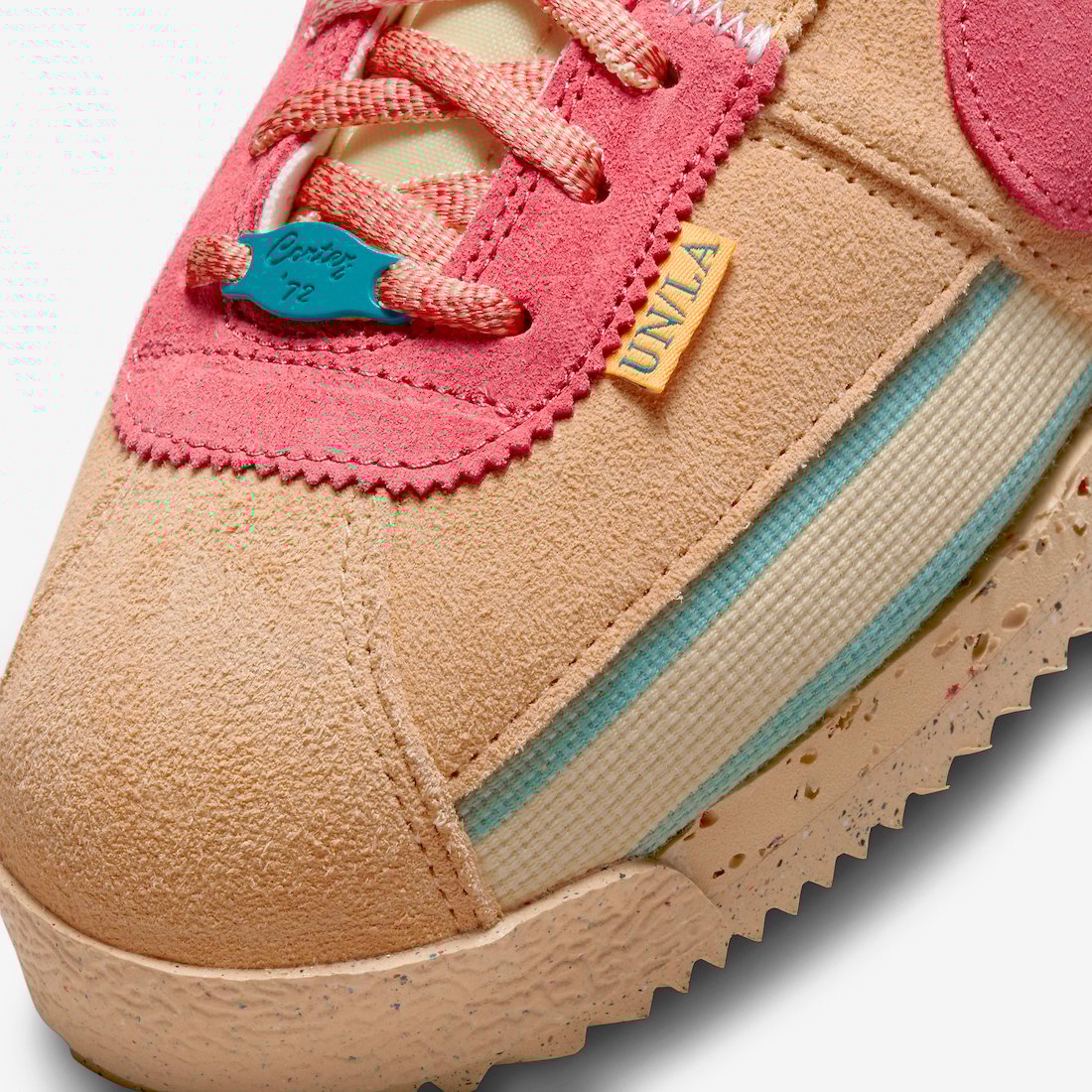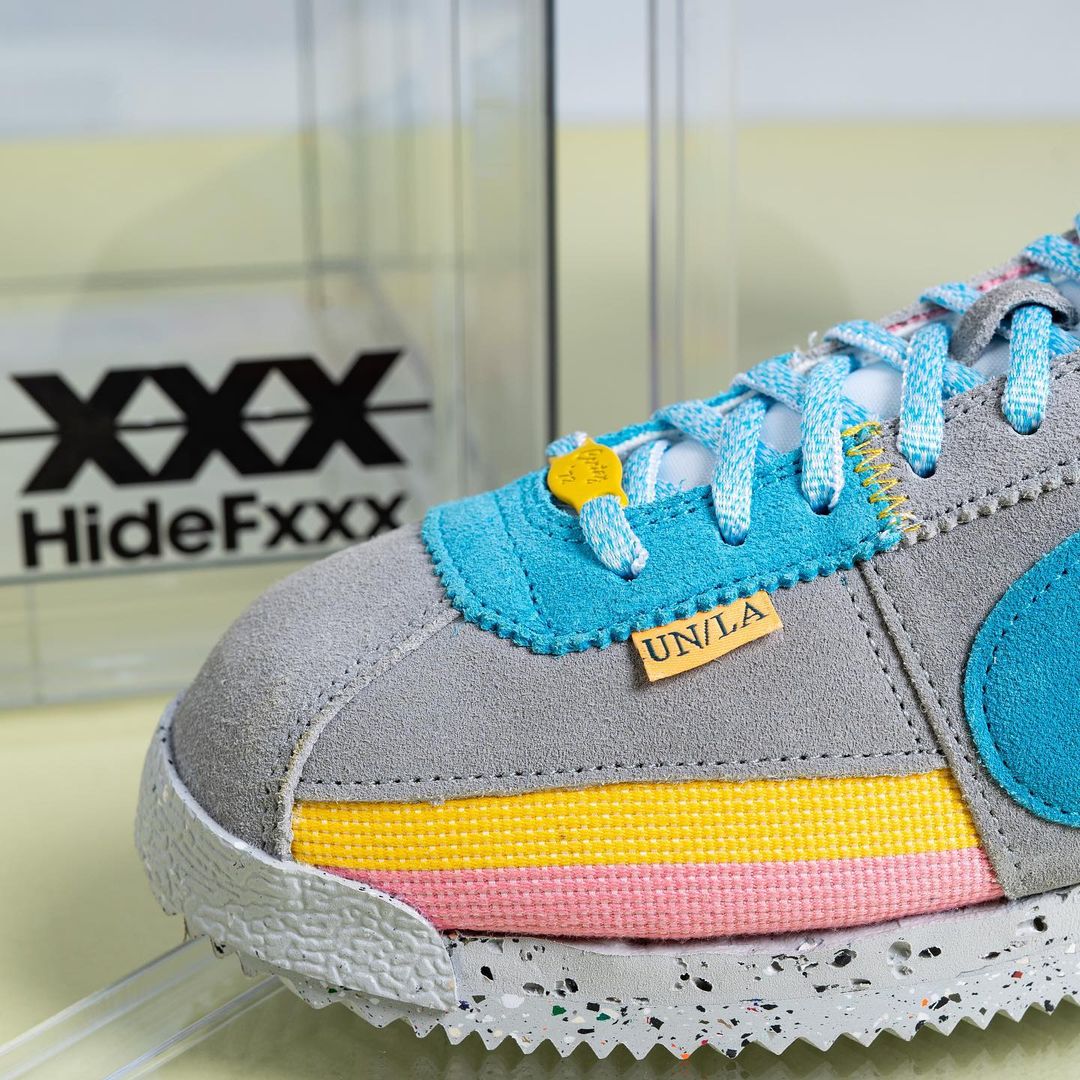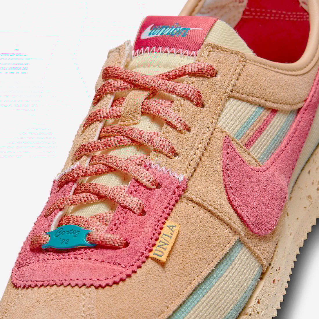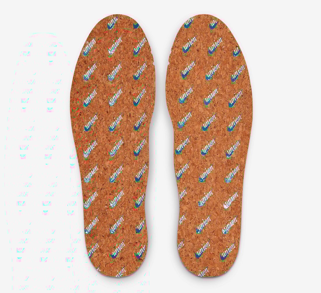 Looking closer, the Union x Nike Cortez features canvas textile on the base while suede appears on the overlays. Next, we have the signature UN/LA labels on the lateral side by the toe. On the heel, we have Unionโs logo, the insoles have an aged look with small chunks missing, and co-branding lands on the cork insoles. Lastly, the pair has a Blue lace jewel.