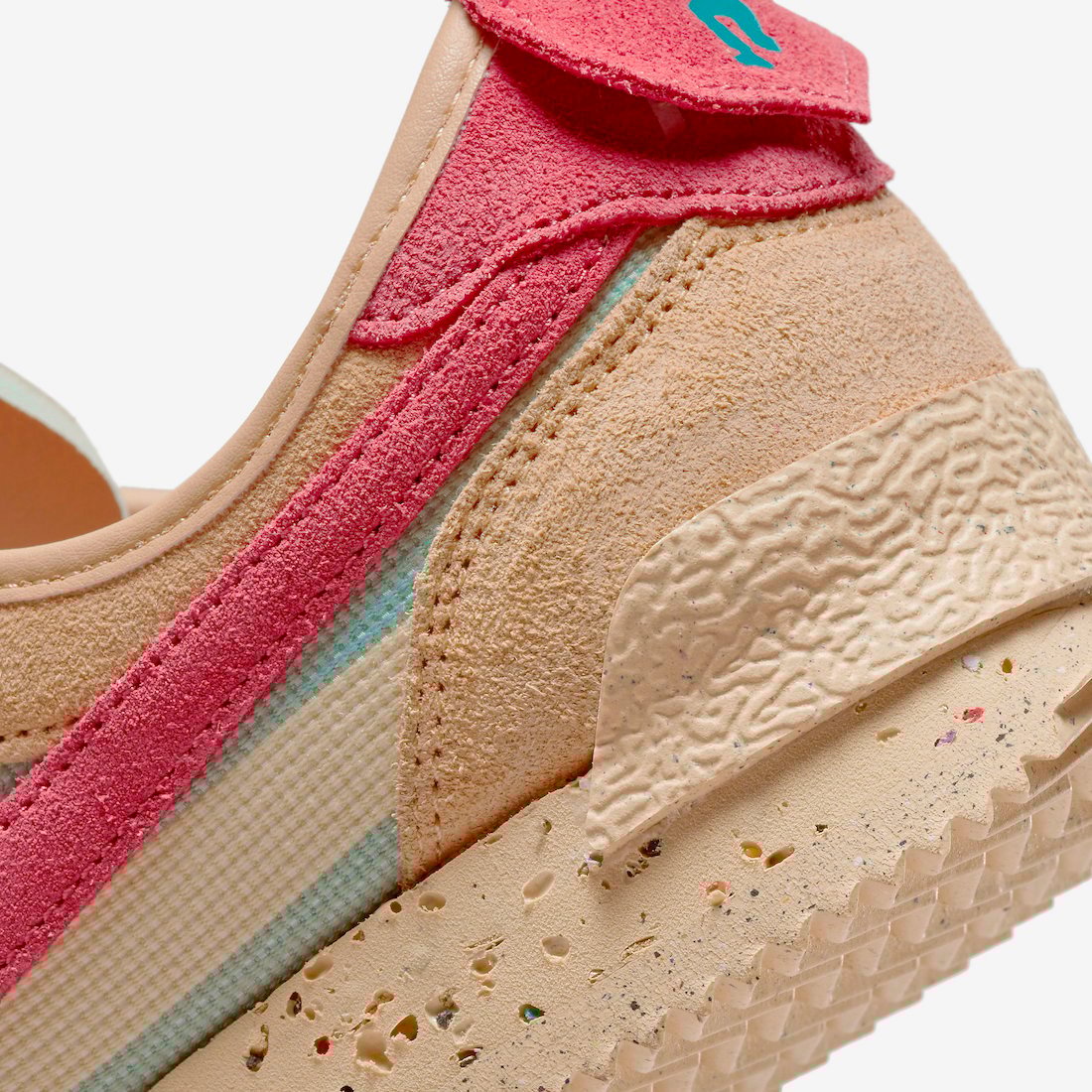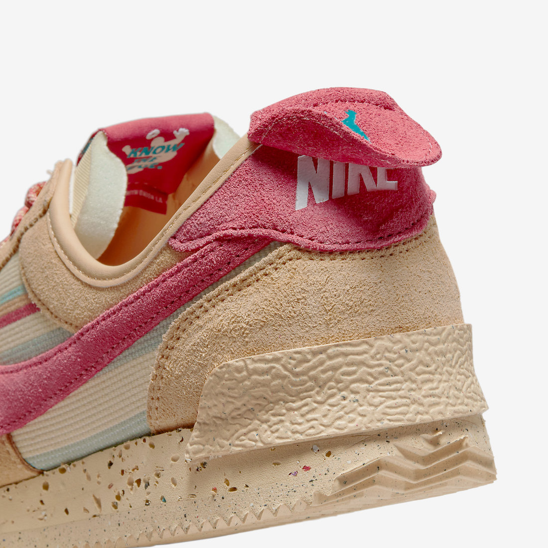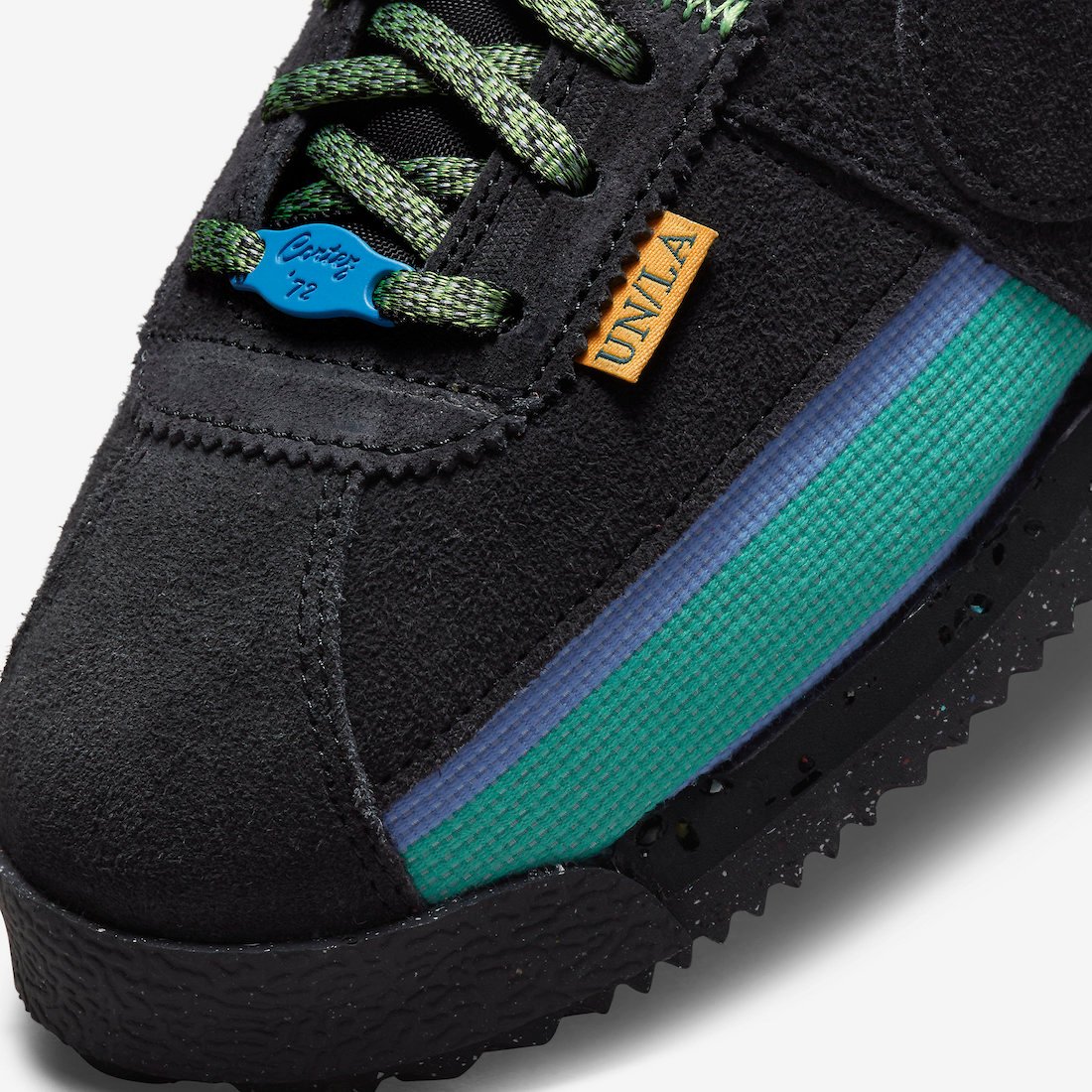 Looking closer, the Union x Nike Cortez features canvas textile on the base while suede appears on the overlays. Next, we have the signature UN/LA labels on the lateral side by the toe. On the heel, we have Unionโs logo, the insoles have an aged look with small chunks missing, and co-branding lands on the cork insoles. Lastly, the pair has a Blue lace jewel.