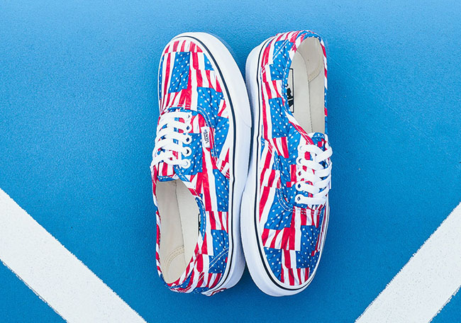 Each pair from the pack sports Red, White and Blue but gets a bit more creative. The Vans SK8-Hi features the American Flag on the base along with an Eagle by the heel. They are completed with Black canvas on the overlays. The Vans Authentic features a similar theme with an all over print of the American Flag. Finishing them off is White across the midsole, liner and laces.