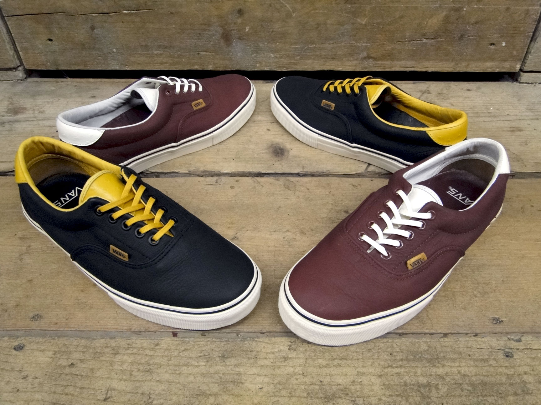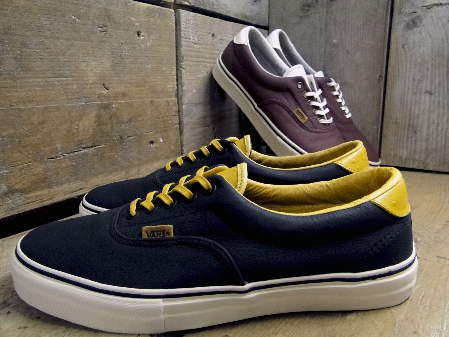 Consisting of the Era 46 LX and Mid Skool 77 LX, the Ostrich Pack features the kicks done up in premium leather navy/gold and burgundy/white colorways. ย All four pairs feature ostrich detailing on the tongue, branding, and heel tab. ย The kicks are completed with white midsoles and gum waffle outsoles.