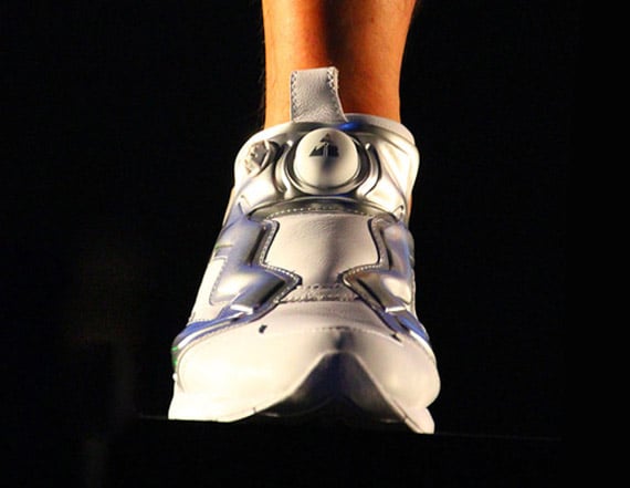Pairing metallic silver with white leather, the kicks see the AMBUSH logo applied to the Pump on the upper.