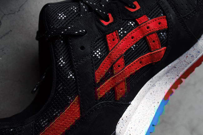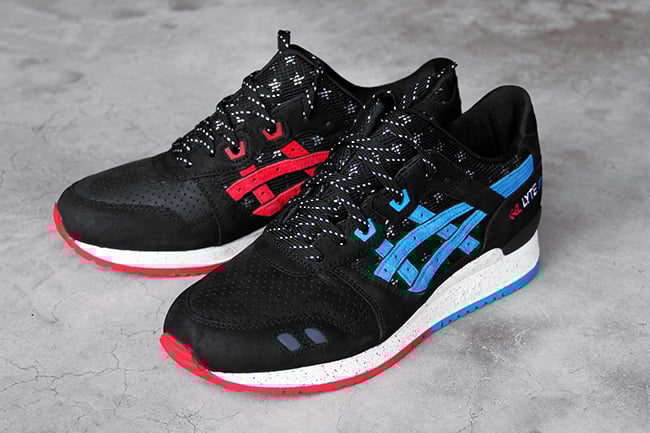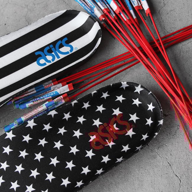 Coming in an Independence Day theme, they feature black upper with alternating red and blue on the Asics branding and outsole. From the teaser and this single image, that’s all we can tell for now.