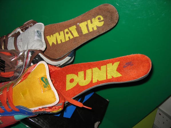 Some interesting yet controversial pictures have shown up online that has left sneaker heads in shock. While some say this pair is real, others say they are fake, but overall its a big mix up. This Nike Dunk SB is called “What the Dunk” for the logo on the insoles, but this pair is FAKE. You can tell by many reasons (logo’s of Raygun and Pigeon off, cement print and more) but the concept is REAL! Nike SB has considered and might actually release a pair like this.