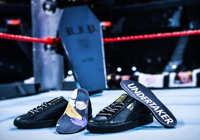 Along with the Puma Clyde releases in White, there will be 23 pairs done in Black for the Undertaker which will come in a Black casket box for $499. A matching t-shirt will also be available for $44.99 only being sold in Orlando.