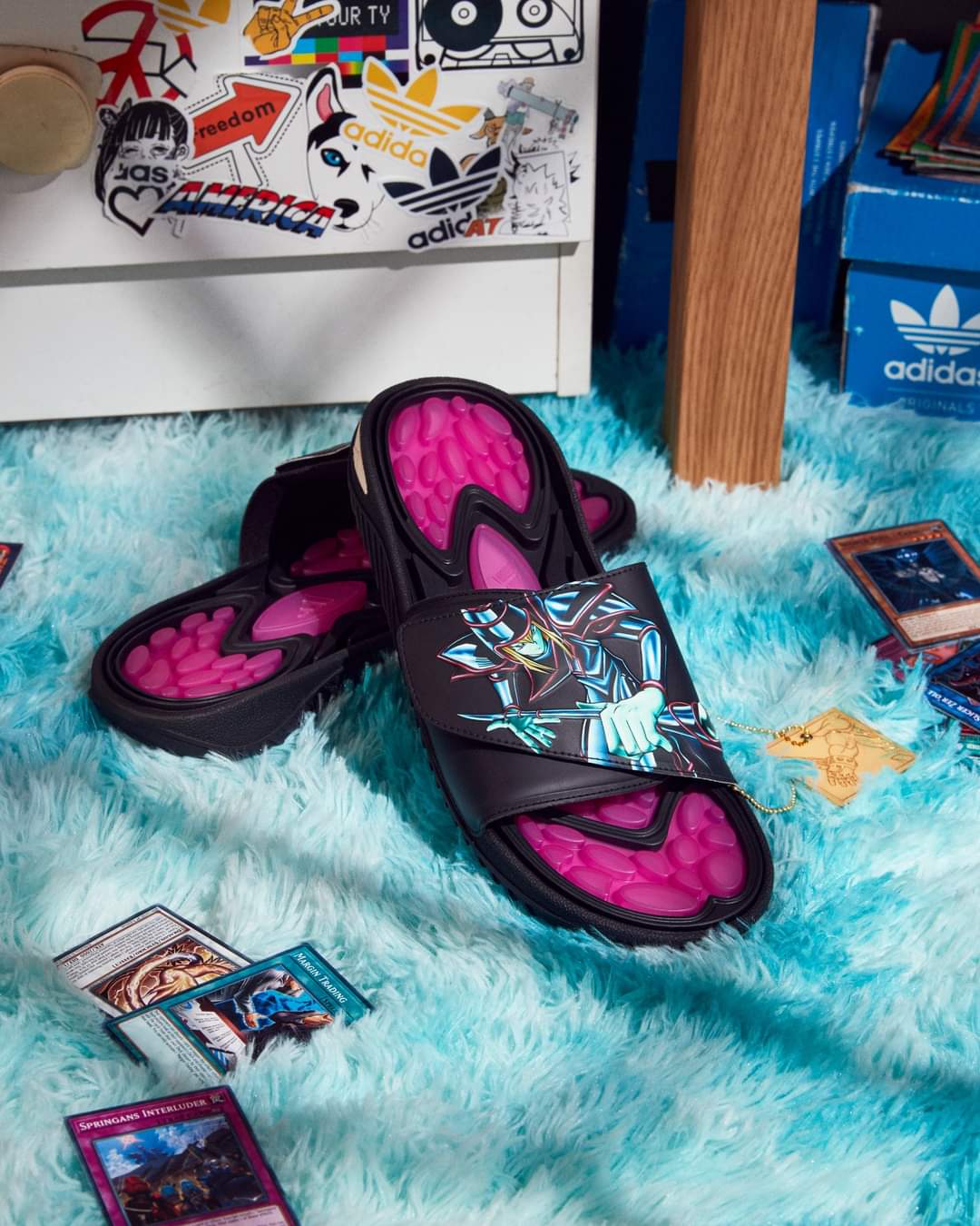 Going over the collection, the adidas ADI2000 is inspired by skate shoes from the early 2000s. The Reptossage is a slide that was initially released in 1999. Tying to the collaboration, the two models pay homage to Yami Yugiโs Dark Magician and Seto Kaibaโs Blue Eyes White Dragon. Each pair has special packaging and a tag that represents a different price of Exodia.